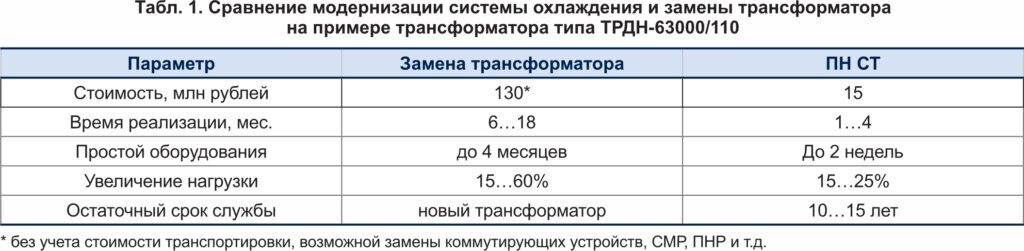 Сравнение модернизации системы охлаждения и замены трансформатора на примере трансформатора типа ТРДН-63000/110 представлено в таблице 1.
